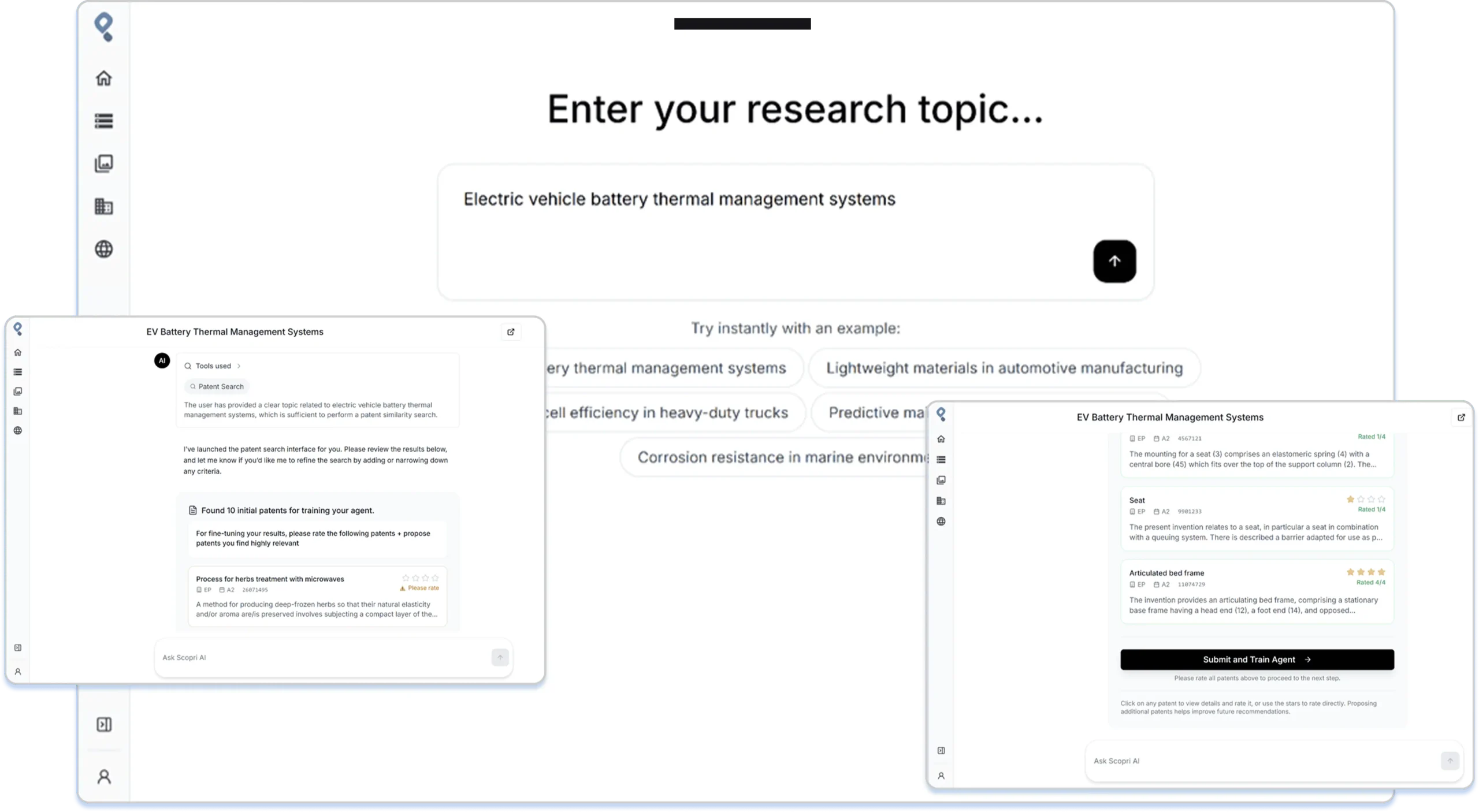 Our software platform lets you initialize highly individual cognitive AI companions to discover patents with contextual analysis. You can discover more than 160 million patents in real-time from official patent sources and analyze compliant results in accordance with upcoming regulations. Check out our roadmap in the blog section for upcoming features.